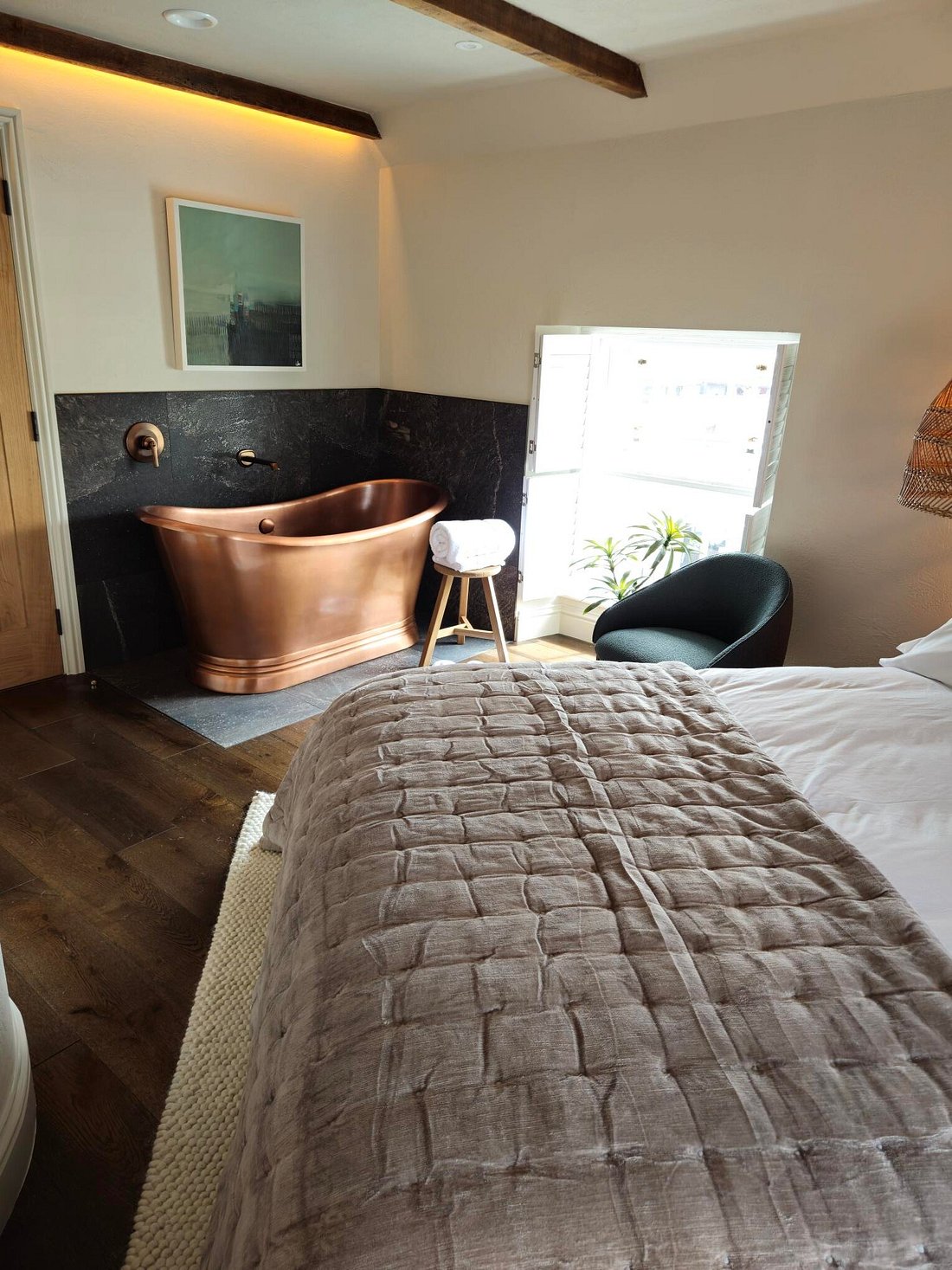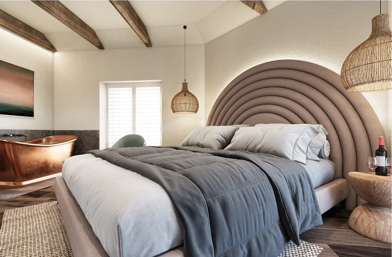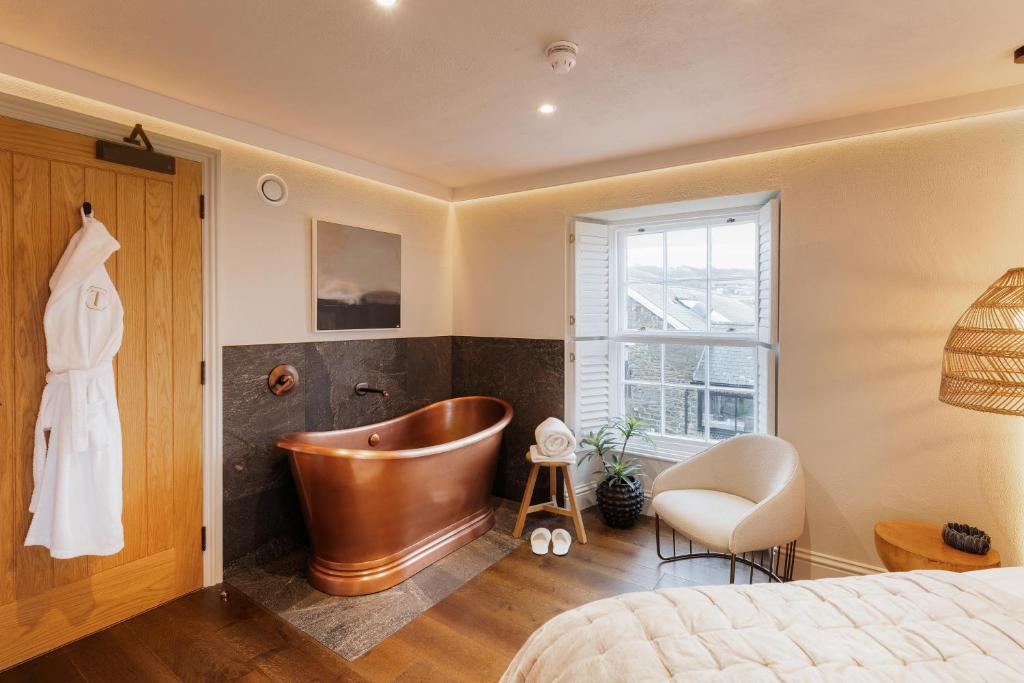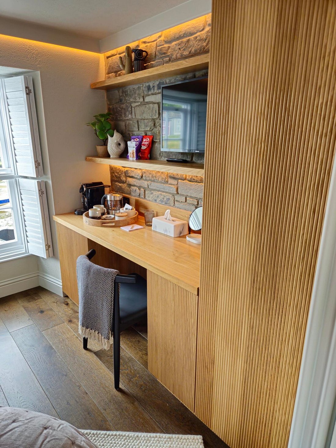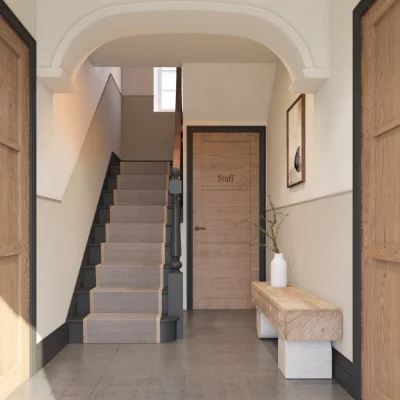 A former accountant's office has been transformed into a boutique guesthouse, featuring six individually designed, elegant bedrooms - each with its own bespoke en-suite and views over Aberaeron’s Georgian harbour. Located within the town's conservation area and housed in a Grade II listed building, the project exudes a warm charm and refined character, blending heritage with contemporary comfort.