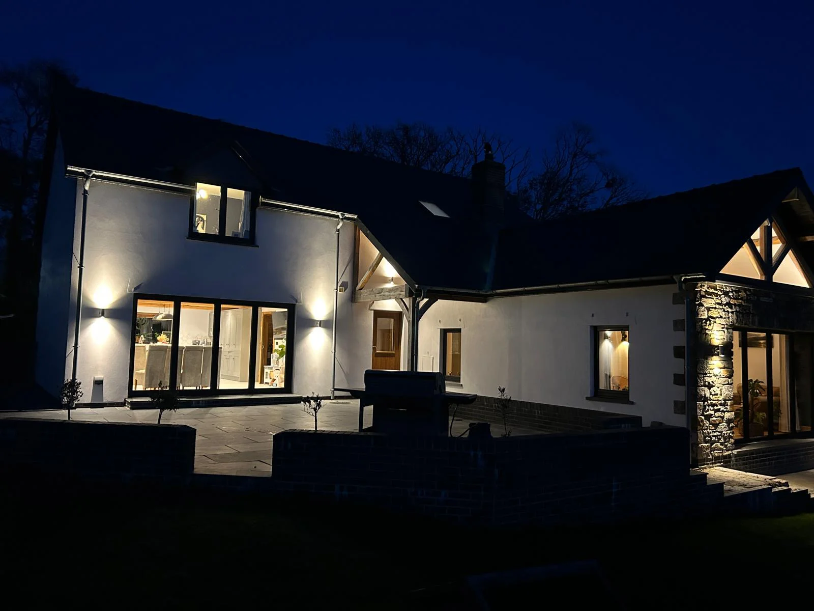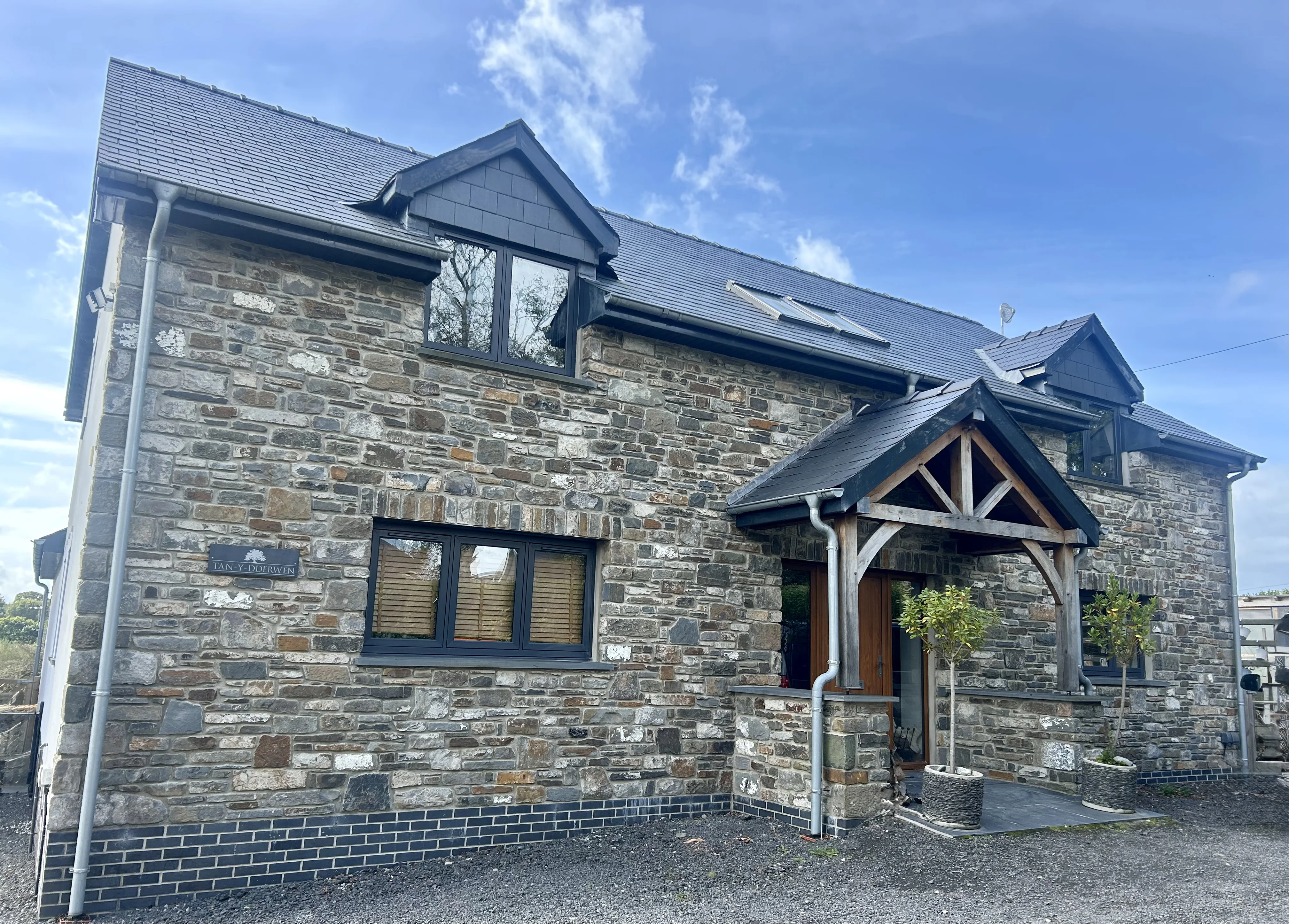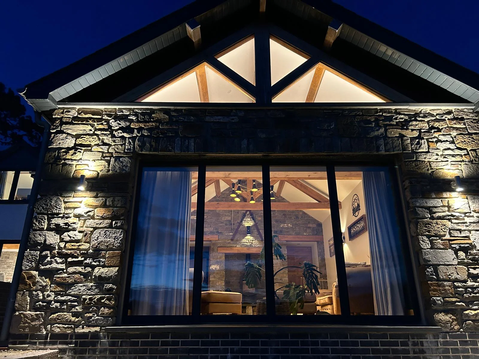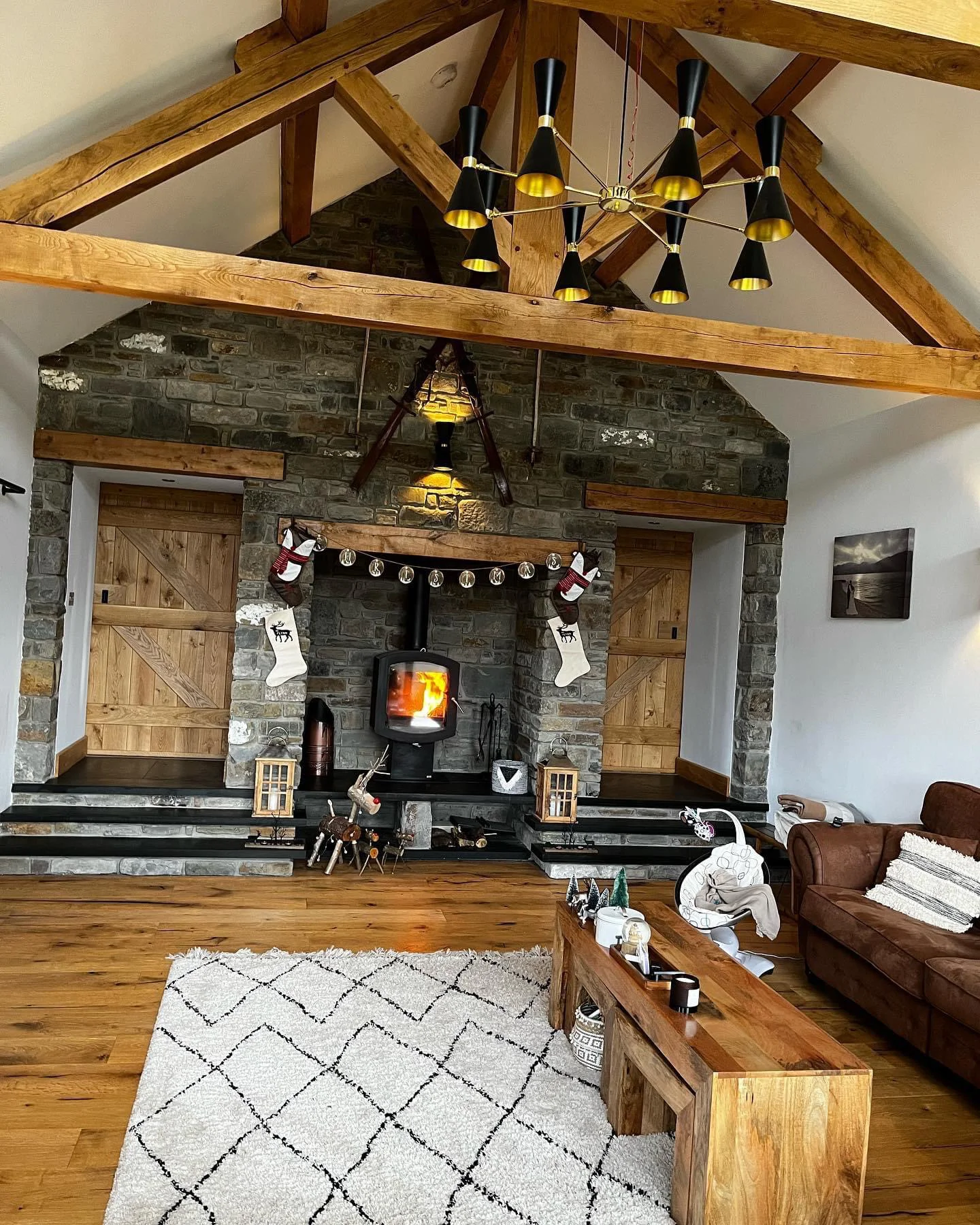 A family home featuring a ski lodge-inspired living room, complete with wall-mounted skies, a striking stone fireplace, and exposed oak beams that add a warm, rustic charm. Built to modern insulation standards and equipped with an air source heat pump, the home is energy-efficient and utilises renewable energy for sustainable living. The exterior showcases a harmonious blend of stone and render, enhanced by anthracite grey flush casement windows and sleek aluminium rainwater goods-striking a perfect balance between traditional character and contemporary design.
