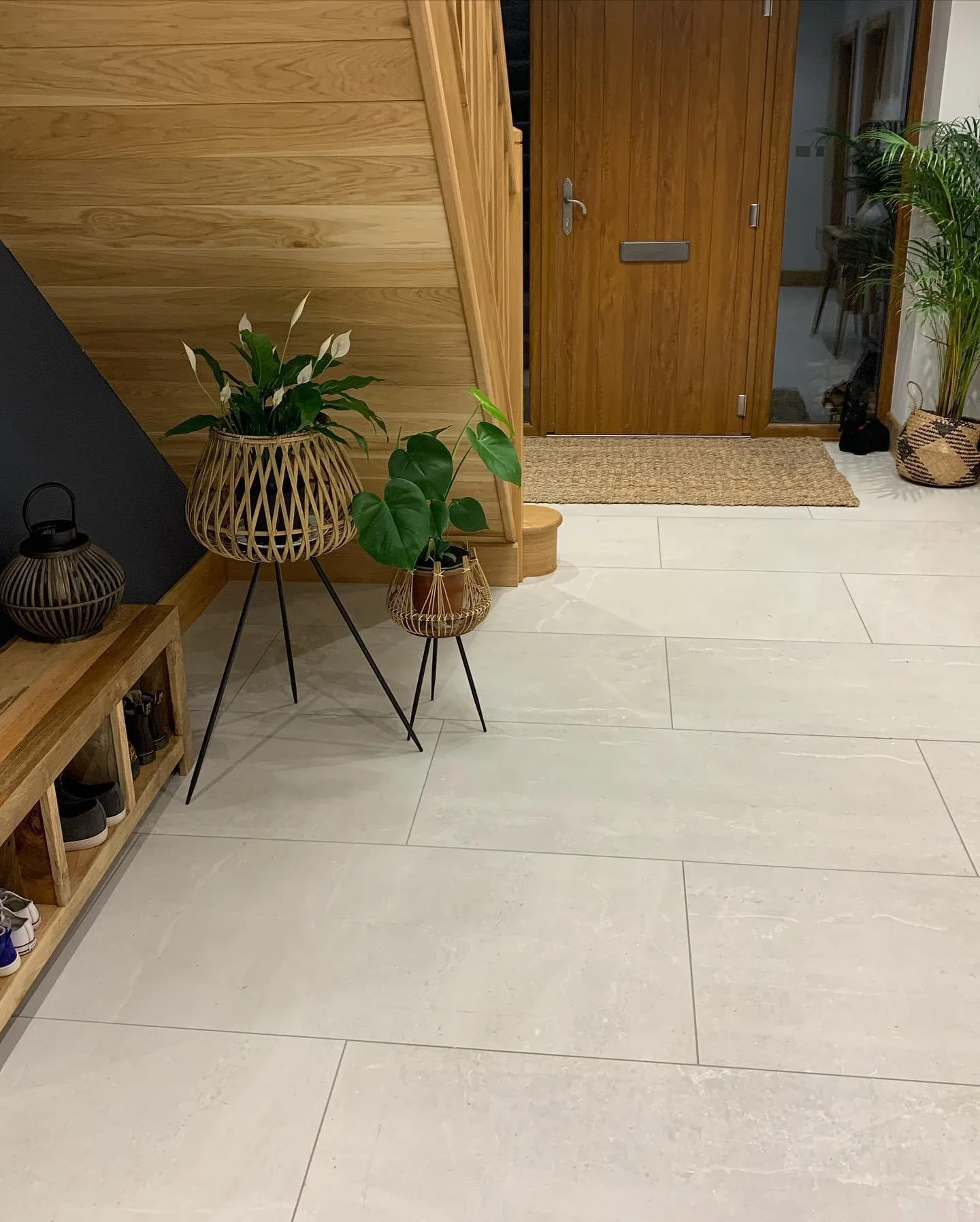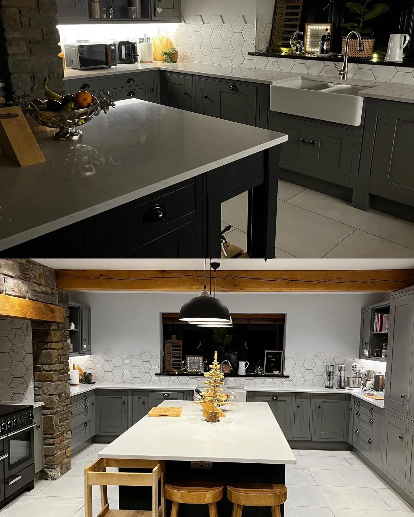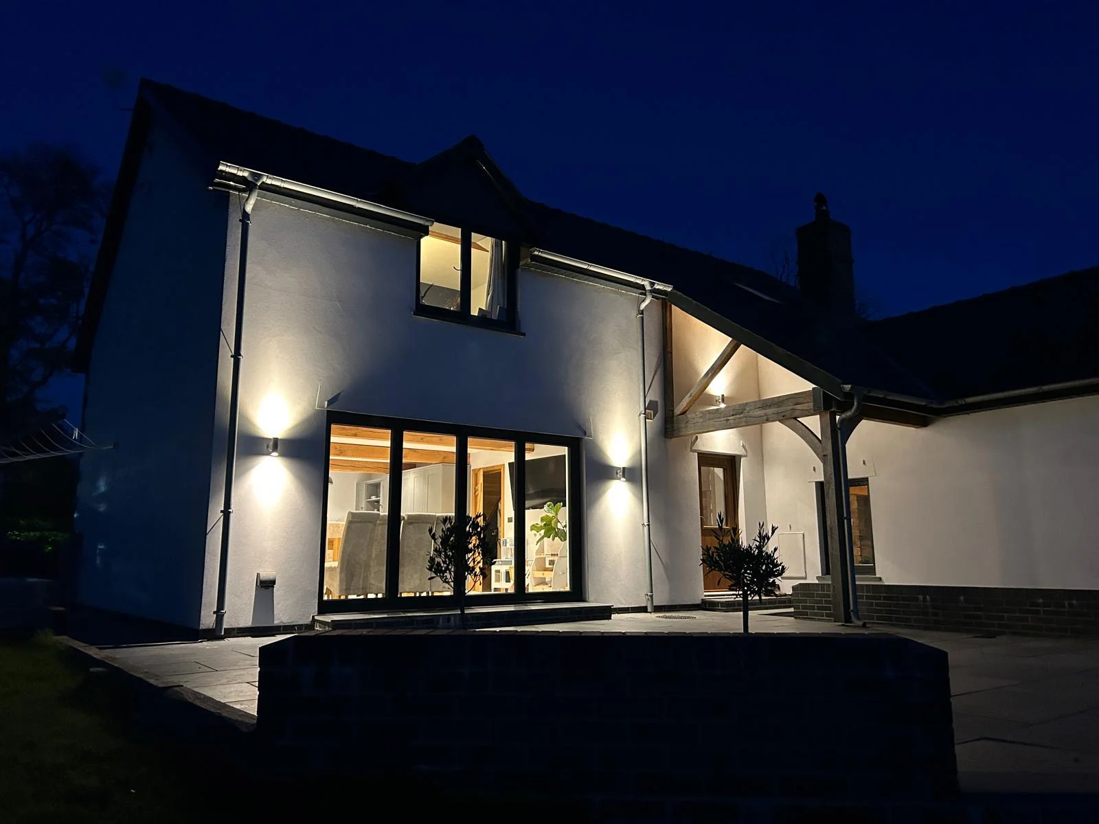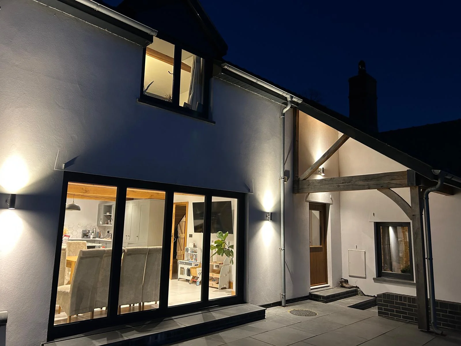 A family home featuring a ski lodge-inspired living room, complete with wall-mounted skies, a striking stone fireplace, and exposed oak beams that add a warm, rustic charm. Built to modern insulation standards and equipped with an air source heat pump, the home is energy-efficient and utilises renewable energy for sustainable living. The exterior showcases a harmonious blend of stone and render, enhanced by anthracite grey flush casement windows and sleek aluminium rainwater goods-striking a perfect balance between traditional character and contemporary design.