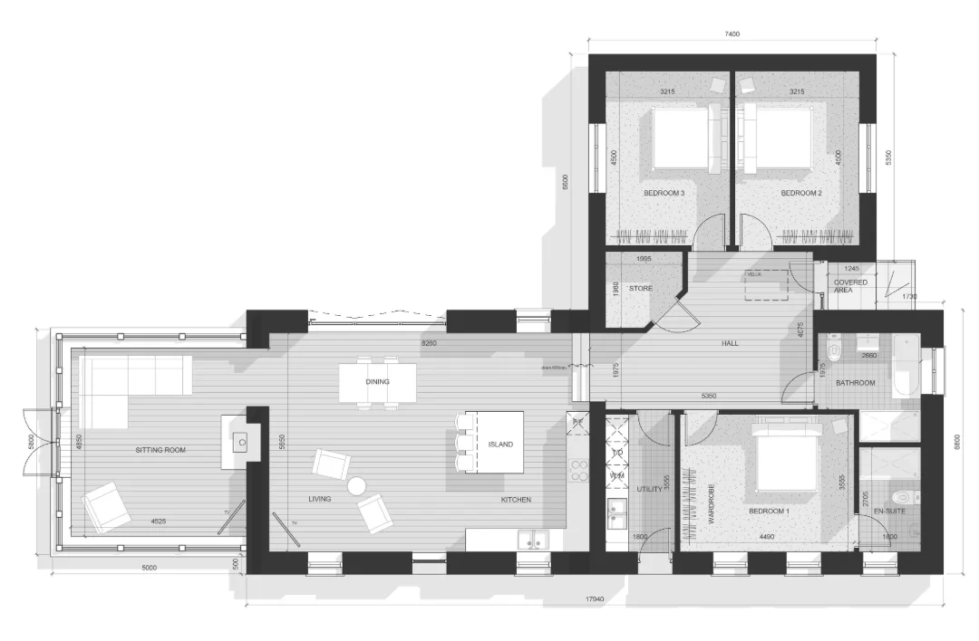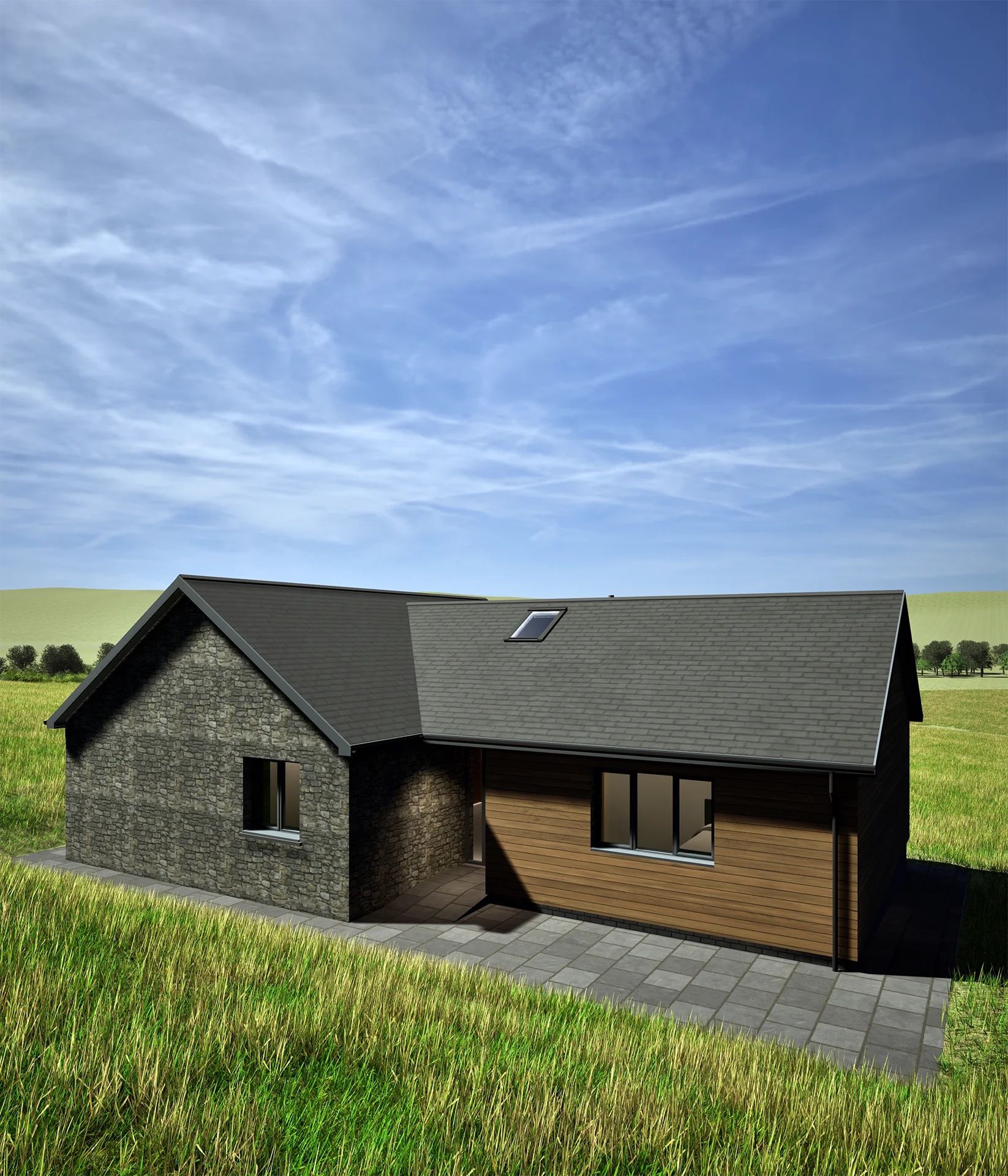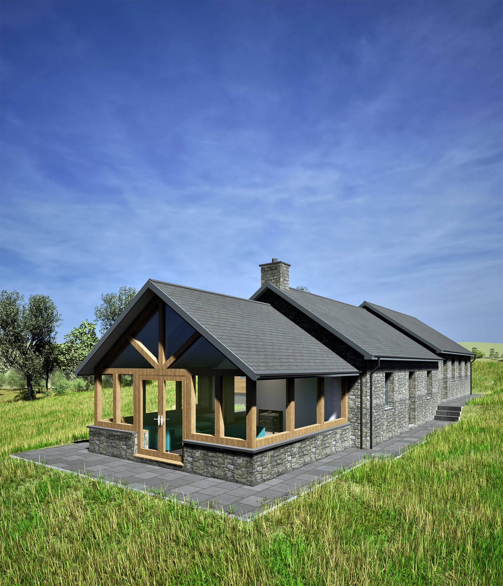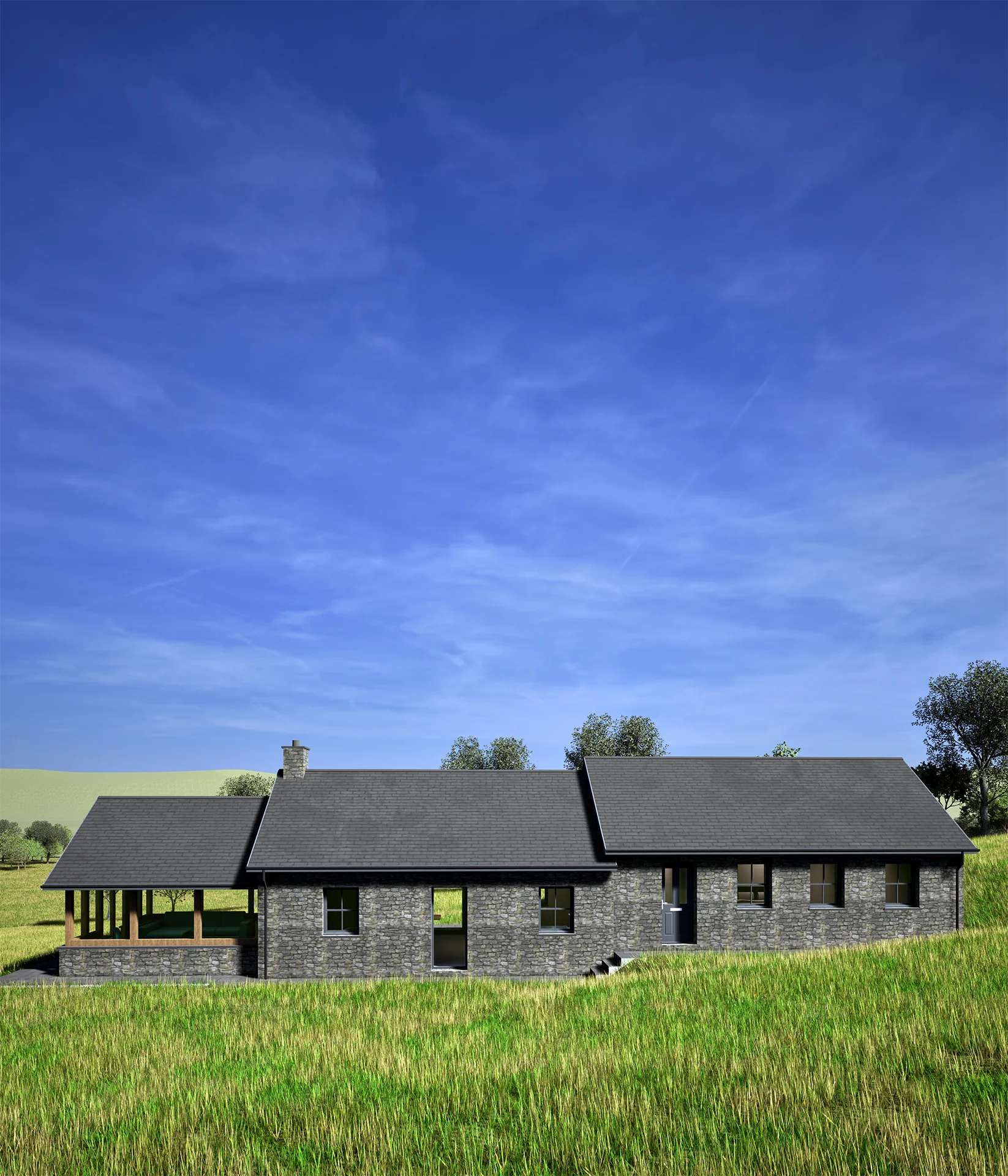 A scheme put together by Huw for a replacement dwelling on the outskirts of Llanrhystud in Ceredigion. With the original dwelling being a traditional Welsh longhouse, we wanted to come up with a proposal that reflected the historic form, with the addition of some modern elements to provide comfortable 21st century living. The design incorporates an open plan living/kitchen/diner, oak frame sunroom and three double bedroom. Externally, the finishes include reclaimed stone from the original building, horizontal timber cladding and an oak frame sunroom, all below a natural slate roof.